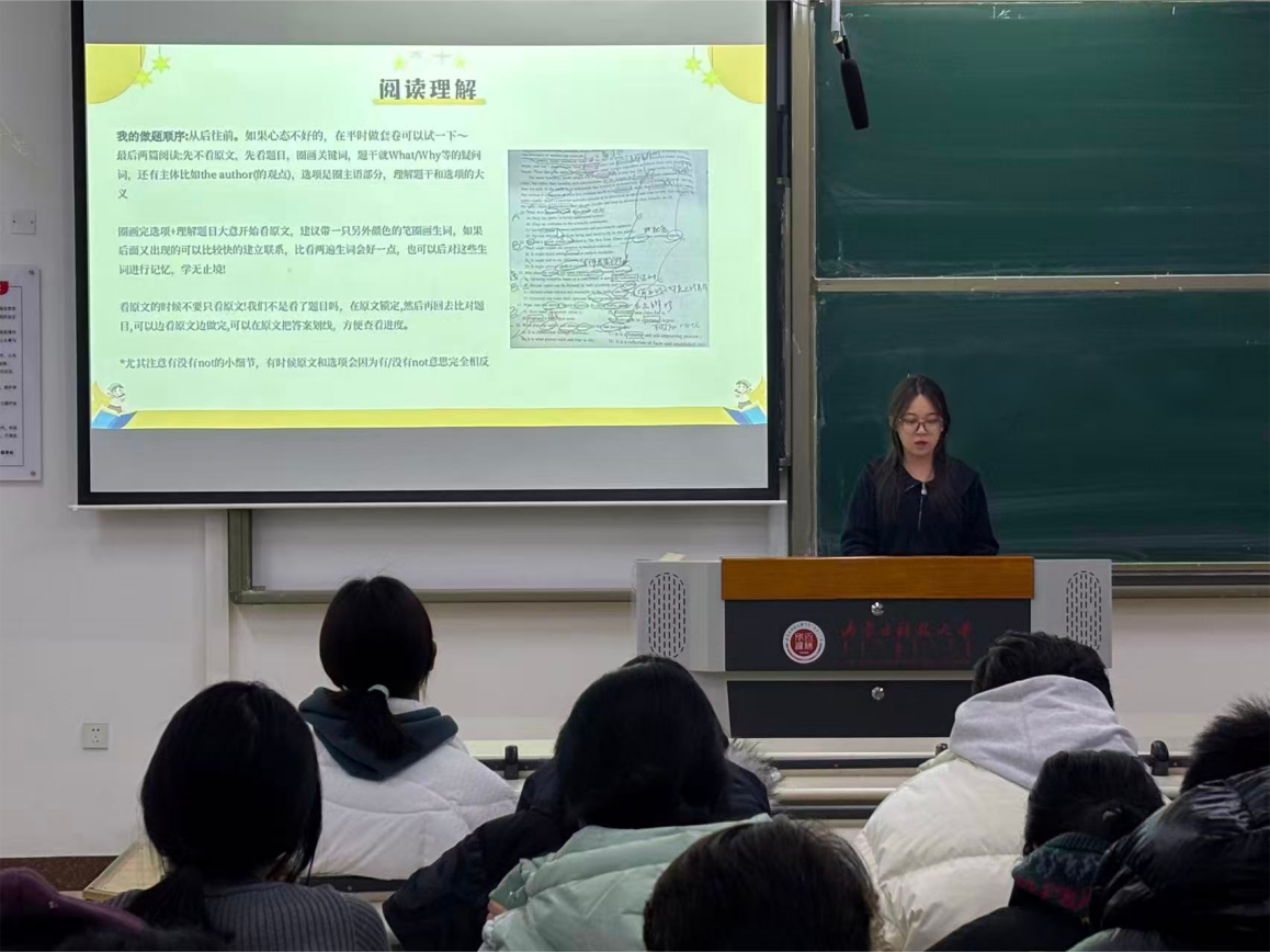 本次活动邀请23级视觉传达设计专业段慧同学主讲,她紧扣最新考试趋势,在现场深入拆解四六级考试结构、分值分布及评分标准,用直观的逻辑梳理让同学们快速掌握考试核心框架。同针对高频考点和备考误区逐一答疑,给同学们带来了极具针对性的经验分享